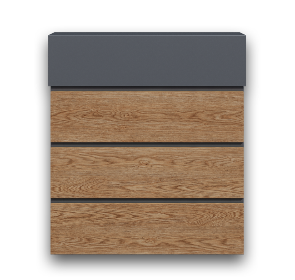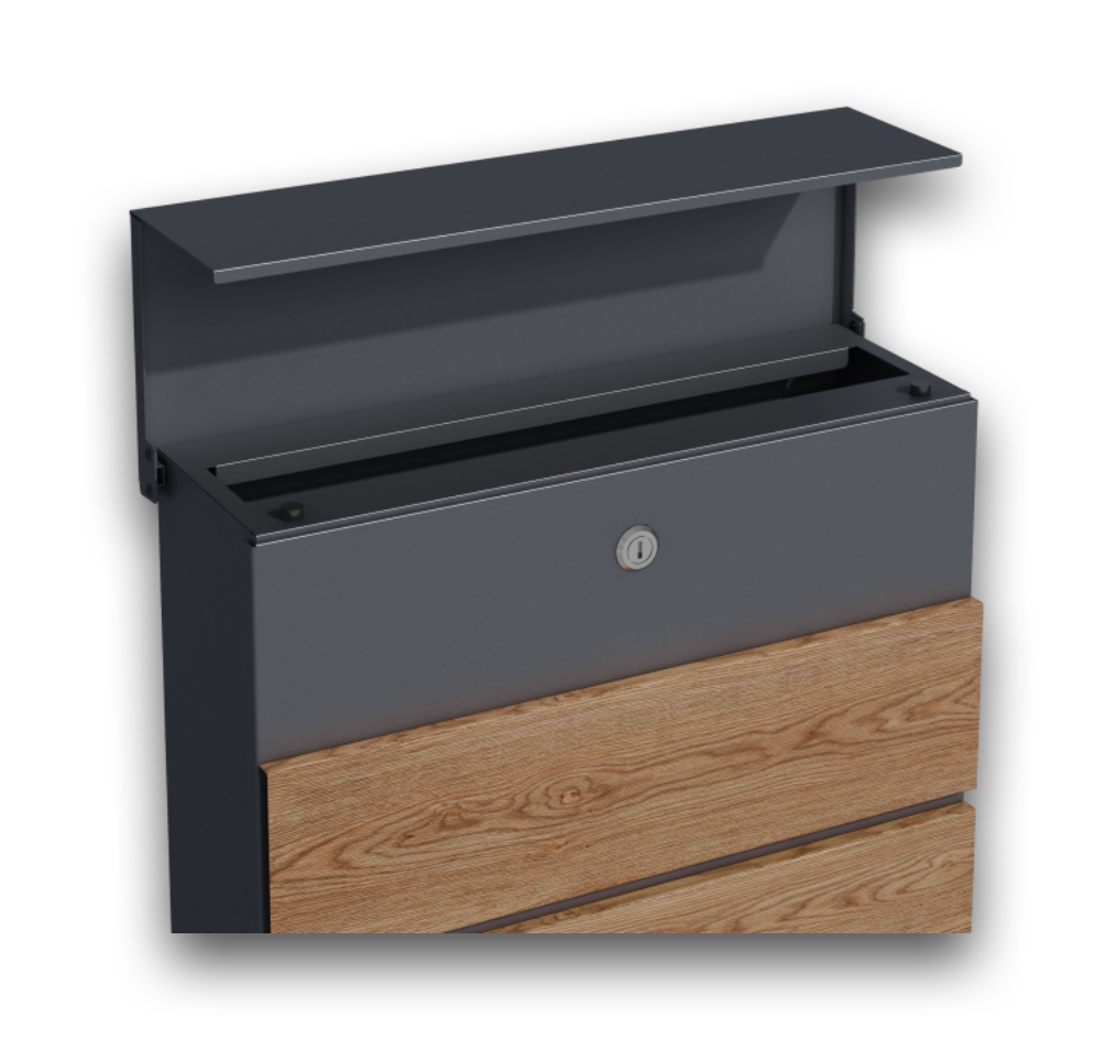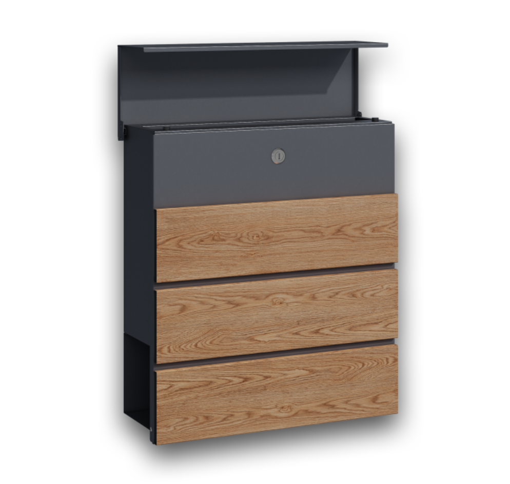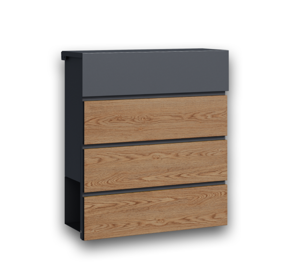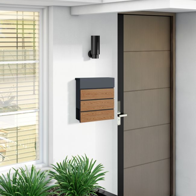 Modern metal mailbox in anthracite and wooden imitation colour features a sleek, minimalist design with a durable, weather-resistant finish. Letterbox offers a contemporary look that complements modern architecture. It includes a secure lock, a front mail slot, and newspaper holder for added functionality.